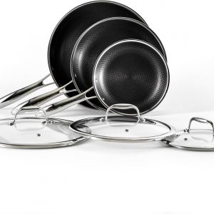 HexClad Hybrid Nonstick 6-Piece Fry Pan Set 8 10 and 12-Inch Frying Pans with Tempered Glass Lids Stay-Cool Handles Dishwasher-Friendly Induction Ready Compatible with All Cooktops