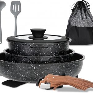 MAISON ARTS Detachable Handle Induction Pots and Pans Set, 10 Piece Non Stick Kitchen Cookware Sets, Stackable Black Granite RV Cooking Set for Camper