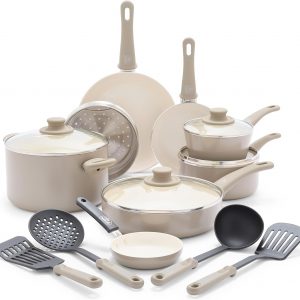 GreenLife 16 Piece Nonstick Cookware Set Soft Grip Non-Toxic PFAS-Free Ceramic Pots and Pans Dishwasher and Oven Safe Frying Sauce Saute Utensils Glass Lids Stay-Cool Handles Wobble Free